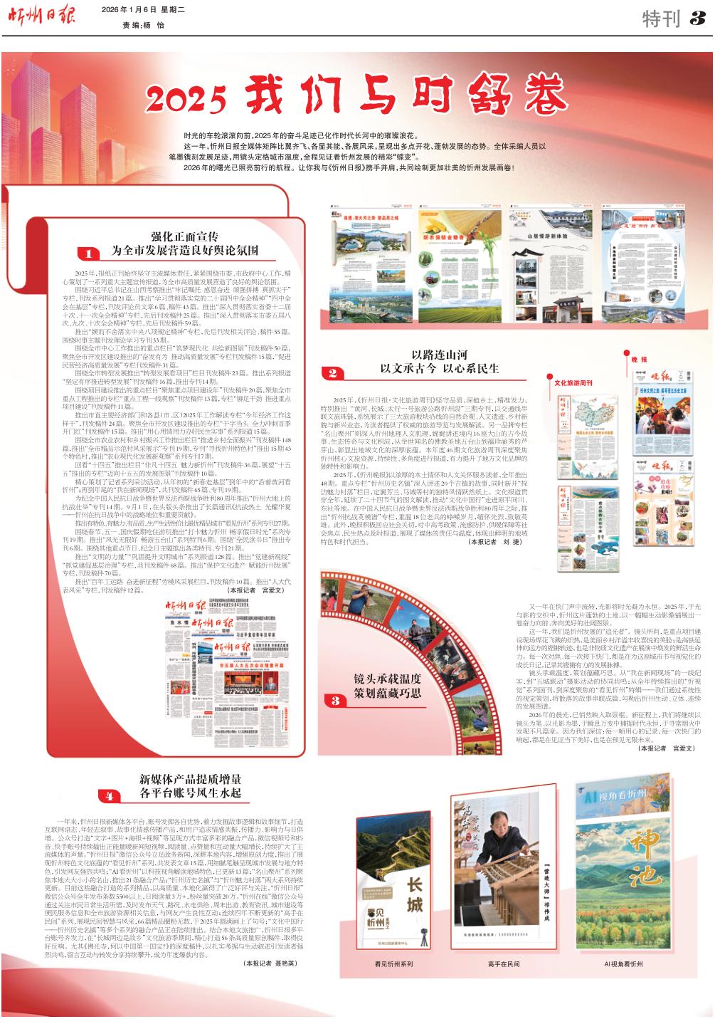 2025年,《忻州晚報(bào)》以濃厚的本土情懷和人文關(guān)懷服務(wù)讀者,全年推出48期。重點(diǎn)專欄“忻州歷史名鎮(zhèn)”深入講述20個(gè)古鎮(zhèn)的故事,同時(shí)新開“探訪魅力村落”欄目,定襄芳蘭、馬城等村的獨(dú)特風(fēng)情躍然紙上。文化報(bào)道貫穿全年,延續(xù)了二十四節(jié)氣的圖文解讀,推動(dòng)“文化中國(guó)行”走進(jìn)原平同川、東社等地。在中國(guó)人民抗日戰(zhàn)爭(zhēng)暨世界反法西斯戰(zhàn)爭(zhēng)勝利80周年之際,推出“忻州抗戰(zhàn)英模譜”專欄,重溫18位老兵的崢嶸歲月,緬懷先烈,致敬英雄。此外,晚報(bào)積極回應(yīng)社會(huì)關(guān)切,對(duì)中高考政策、流感防護(hù)、供暖保障等社會(huì)焦點(diǎn)、民生熱點(diǎn)及時(shí)報(bào)道,展現(xiàn)了媒體的責(zé)任與溫度,體現(xiàn)出鮮明的地域特色和時(shí)代擔(dān)當(dāng)。(本報(bào)記者劉捷)