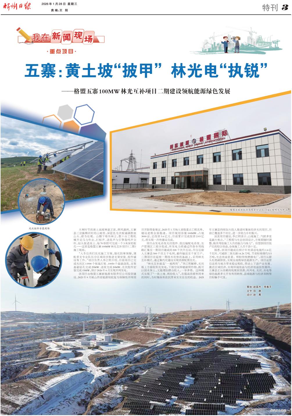 大寒時節(jié)的黃土高坡寒意正濃,朔風凜冽,五寨縣三岔鎮(zhèn)柳河村的山坳里,深藍色光伏板鋪滿數(shù)座山頭,蔚為壯觀。山腳下塔吊林立,數(shù)十臺工程機械開足馬力作業(yè),打樁聲、澆筑聲與引擎轟鳴聲交織,鉆頭旋進凍土,每70秒即可完成一個3米深的樁孔——這里是格盟五寨100MW林光互補項目(二期)施工現(xiàn)場。