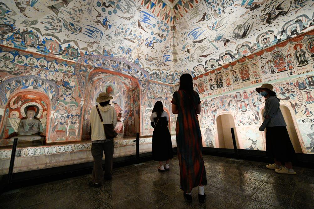 2024年6月7日,在敦煌石窟文物保護研究陳列中心,游客參觀莫高窟復(fù)制洞窟第276窟壁畫。新華社記者 郎兵兵 攝 “莫高窟無疑是敦煌最具標志性的瑰寶,這里是世界上現(xiàn)存歷史最悠久、規(guī)模最宏大、內(nèi)容最豐富、保存最完整的佛教藝術(shù)寶庫之一,被譽為‘大漠里的藝術(shù)館’?!碧m州大學(xué)敦煌學(xué)研究所所長鄭炳林說。