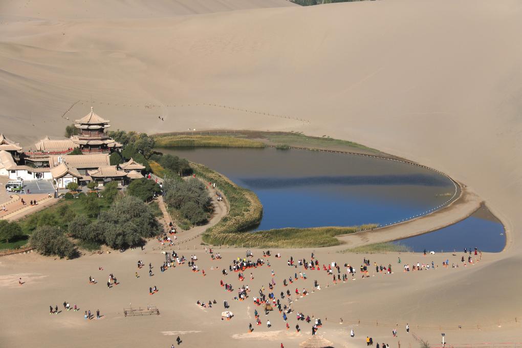 2024年10月3日,游客在甘肅省敦煌市鳴沙山月牙泉景區(qū)游覽。張曉亮 攝 “來一次就會愛上。” 月牙泉是沙漠的眼睛,依舊倒映著漢唐的明月。駝隊曾經(jīng)從這里經(jīng)過,駝鈴聲串起長安與羅馬的夢。絲綢是流動的彩虹,瓷器是凝固的月光,經(jīng)卷里藏著智慧的種子,在歐亞大陸上生根發(fā)芽。 “在這里游客不僅可以欣賞大漠風(fēng)光,體驗絲路風(fēng)情,還可以品味莫高神韻,感悟敦煌文化。”敦煌市文體廣電和旅游局副局長楊紅說。