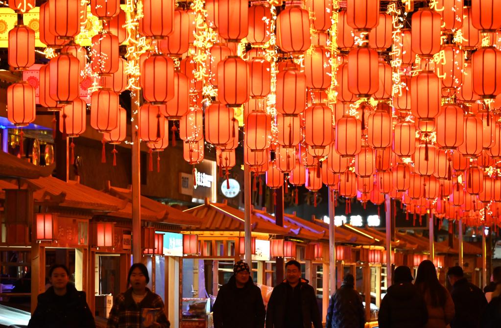 2025年1月27日晚,游客在甘肅省敦煌夜市游覽。張曉亮 攝 敦煌不是一座城,而是一個永恒的意象。她是大漠中的綠洲,是時光長河中的一方印章,蓋在華夏文明最絢麗的篇章上。