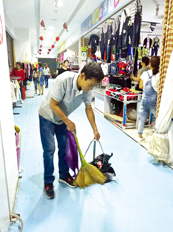 整個(gè)云河商場(chǎng)只有一層,共60多家商戶,衛(wèi)生清潔一天3次,工作量雖然不是很大,卻也不輕松。記者見(jiàn)到老馬時(shí),他正在做商場(chǎng)關(guān)門(mén)前的最后一次清掃。不時(shí)有商戶喊老馬過(guò)去收紙箱和塑料袋,老馬加快了手里的動(dòng)作?!吧虉?chǎng)是公共場(chǎng)所,管理也挺嚴(yán)格的,我得隨時(shí)注意看哪里有了垃圾,或是公共設(shè)施出了問(wèn)題,要不人來(lái)人往怕出事。干凈整潔的環(huán)境代表著商場(chǎng)的形象,也能讓顧客購(gòu)物時(shí)有個(gè)好心情,這也是我工作的價(jià)值吧。”老馬坦言,有的人衛(wèi)生習(xí)慣特別不好。商場(chǎng)里童裝生意最為火爆,有個(gè)別帶孩子的家長(zhǎng)直接讓孩子隨地大小便,不僅弄臟了環(huán)境也作了不良示范。老馬希望通過(guò)創(chuàng)衛(wèi),大家愛(ài)護(hù)環(huán)境衛(wèi)生的意識(shí)得到提高,這樣他也可以輕松點(diǎn)了。(王菲)