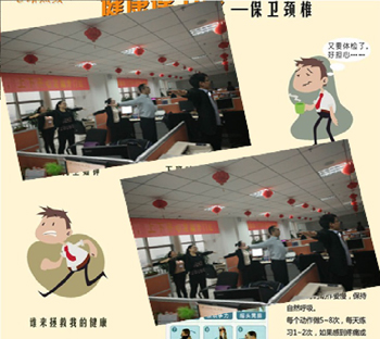 開門紅戰(zhàn)役打響,全員全身心投入,同時對職場內(nèi)員工的身體健康尤其是頸椎健康更是極大挑戰(zhàn)。中支綜管部門及時提醒辦公室內(nèi)的上班族,應(yīng)該保護(hù)頸椎健康,提示半小時后應(yīng)該起身活動一下,用頭寫“米”字,并適時組織員工停下手中的工作,打開電視機,集中做好工間勁椎操。保護(hù)頸椎,保護(hù)自己,服務(wù)公司,以充沛的體能服務(wù)開門紅戰(zhàn)役。