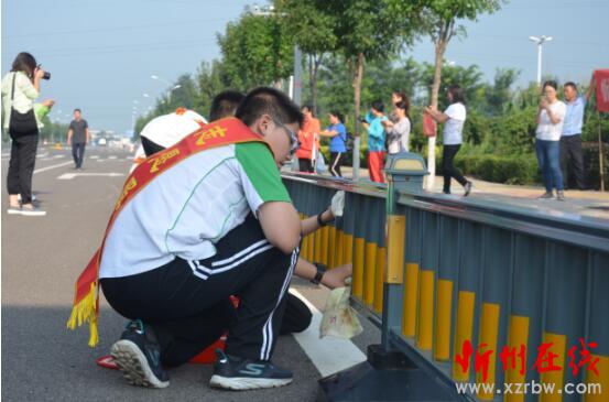 參加活動的學生,在環(huán)衛(wèi)工人指導下擦試道路中間的隔離欄。