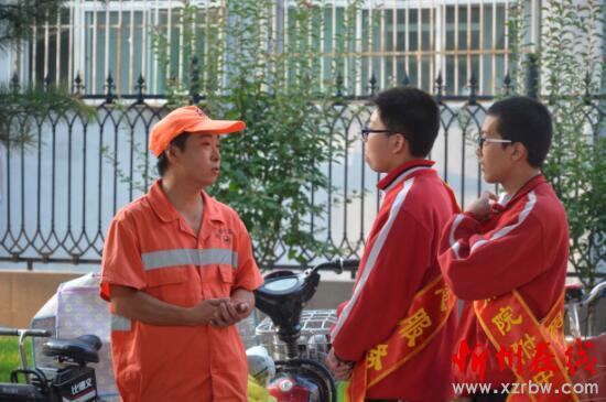 圖為學生和完成晨掃的環(huán)衛(wèi)工人進行交談。