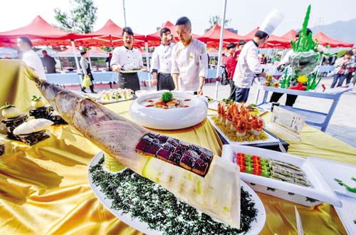 竹筍是杭州市臨安區(qū)的經濟主產業(yè),被稱為臨安農民的第一棵“搖錢樹”?!鞍俟S宴”是臨安傳統(tǒng)的特色名宴,被認定為“中華特色名宴”,其包含的與竹筍有關的數百道筍菜佳肴,凝聚著濃厚的吳越美食文化。這是“百筍宴”活動現場展示的與筍有關的特色菜肴據新華社 記者 徐 昱 攝