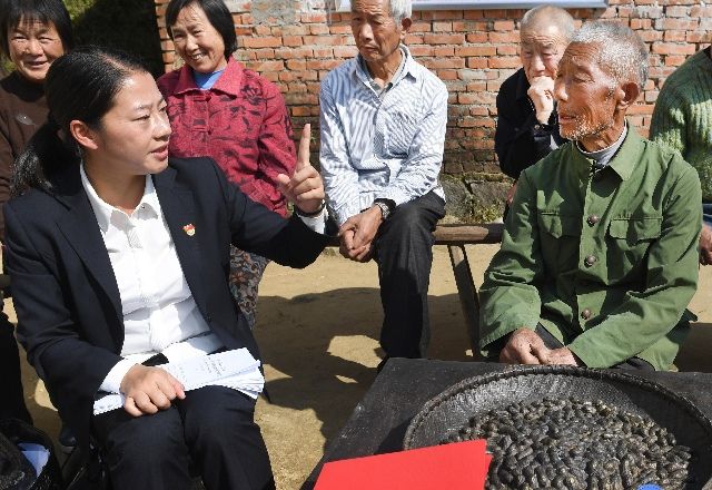 安徽省金寨縣花石鄉(xiāng)大灣村扶貧工作隊(duì)副隊(duì)長余靜(前左)在金寨縣大灣村與村民交流。新華社發(fā)