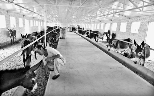 河曲縣樓子營鎮(zhèn)柏鹿泉村驛騰養(yǎng)殖專業(yè)合作社由致富帶頭人趙志文2017年9月創(chuàng)辦,主要從事肉驢養(yǎng)殖,該合作社采取“合作社+貧困戶”的產(chǎn)業(yè)發(fā)展模式,貧困戶每養(yǎng)一頭驢固定收益1180元,有效帶動當(dāng)?shù)睾椭苓?0個(gè)村439戶823人增收致富。目前,現(xiàn)存欄肉驢600頭,年盈利70余萬元。圖為一名飼養(yǎng)員在為驢添加飼草。(鄔耿杰 攝)