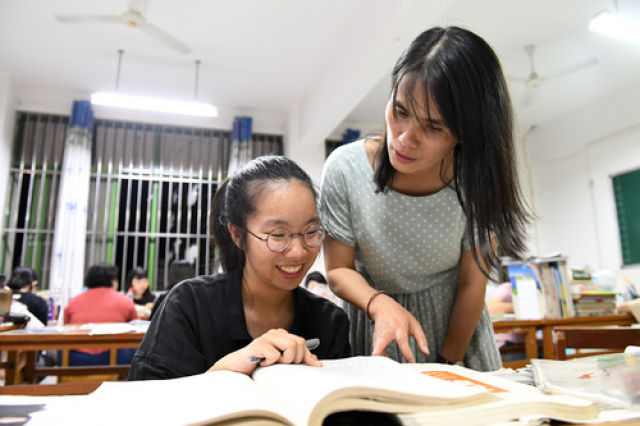 廣西都安縣高級中學老師韋喜鳳(右)在輔導學生功課(6月6日攝)。新華社記者 陸波岸 攝