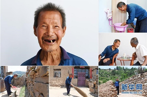 魏連保,男,1949年出生,山西省長治市沁源縣支角村人。獨(dú)居的他生活不便,2017年年底,村委會(huì)為魏連保在內(nèi)的8位老人修建了一排整齊的新居,并統(tǒng)一安排就餐。 左上:魏連保肖像;右上:魏連保在新居洗臉;右中:魏連保(左)在新居和鄰居李秀成聊天;下右:魏連保在舊居前留影;下中:魏連保在舊居打掃院子;下左:魏連保在舊居為蔬菜澆水(拼版照片,6月18日攝)。 地處晉東南的山西省長治市,位于由太行山、太岳山環(huán)繞而成的上黨盆地中。在群山中、崖壁上,許多村莊自然條件惡劣,基礎(chǔ)設(shè)施落后,脫貧致富是大山深處人們的迫切心愿。 近年來,一場場脫貧攻堅(jiān)戰(zhàn),在一個(gè)個(gè)深山村打響。政府全力探索脫貧路徑的同時(shí),山區(qū)百姓因地制宜,靠自己的雙手和智慧走上致富路,交出了一份扎實(shí)的脫貧答卷。 記者在太行山、太岳山一路尋訪,記錄下多位70歲老人的生活。這些共和國的同齡人,親歷了山鄉(xiāng)的巨變,見證著長治山區(qū)脫貧攻堅(jiān)偉大工程的一步步推進(jìn)。 新華社記者 楊晨光 攝