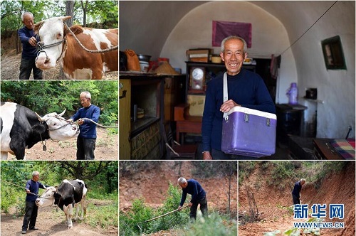 曹晉忠,男,1949年出生,山西省長治市武鄉(xiāng)縣鋪上村人。曹晉忠是村里的動(dòng)物防疫員,自己種了4畝玉米、2畝小米。因?yàn)槠拮映D昱P病在床,曹晉忠一家是該村的精準(zhǔn)扶貧對(duì)象。曹晉忠說,醫(yī)護(hù)人員經(jīng)常上門進(jìn)行健康狀況隨訪,駐村工作隊(duì)也常來家里幫忙,現(xiàn)在看病不發(fā)愁,干活有人幫,生活挺好的。 右上:曹晉忠肖像;左上、左中、左下:曹晉忠在給村里的牛做檢查;下中、下右:曹晉忠在地里干農(nóng)活(拼版照片,6月12日攝)。 地處晉東南的山西省長治市,位于由太行山、太岳山環(huán)繞而成的上黨盆地中。在群山中、崖壁上,許多村莊自然條件惡劣,基礎(chǔ)設(shè)施落后,脫貧致富是大山深處人們的迫切心愿。 近年來,一場場脫貧攻堅(jiān)戰(zhàn),在一個(gè)個(gè)深山村打響。政府全力探索脫貧路徑的同時(shí),山區(qū)百姓因地制宜,靠自己的雙手和智慧走上致富路,交出了一份扎實(shí)的脫貧答卷。 記者在太行山、太岳山一路尋訪,記錄下多位70歲老人的生活。這些共和國的同齡人,親歷了山鄉(xiāng)的巨變,見證著長治山區(qū)脫貧攻堅(jiān)偉大工程的一步步推進(jìn)。 新華社記者 詹彥 攝