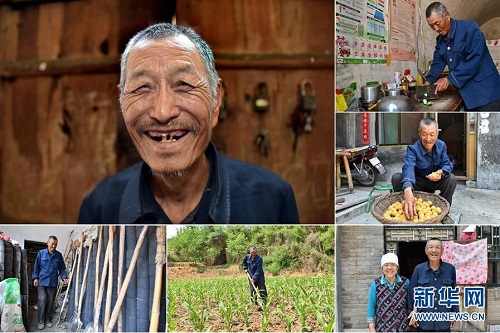 李增福,男,1949年出生,山西省長治市潞城區(qū)上黃村人,自己和老伴都患有較嚴重的慢性病,家里6口人靠種植6畝玉米地為生,生活貧困。2016年女兒和女婿參加了村里組織的脫貧技能培訓并開了一家特色面食店,家里的日子逐漸好了起來。 左上:李增福肖像;右上:李增福在切菜;右中:李增福在晾曬剛摘的杏;右下:李增福和老伴合影;下中:李增福在田地里鋤草;下左:李增福在挑選農(nóng)具(拼版照片,6月11日攝)。 地處晉東南的山西省長治市,位于由太行山、太岳山環(huán)繞而成的上黨盆地中。在群山中、崖壁上,許多村莊自然條件惡劣,基礎設施落后,脫貧致富是大山深處人們的迫切心愿。 近年來,一場場脫貧攻堅戰(zhàn),在一個個深山村打響。政府全力探索脫貧路徑的同時,山區(qū)百姓因地制宜,靠自己的雙手和智慧走上致富路,交出了一份扎實的脫貧答卷。 記者在太行山、太岳山一路尋訪,記錄下多位70歲老人的生活。這些共和國的同齡人,親歷了山鄉(xiāng)的巨變,見證著長治山區(qū)脫貧攻堅偉大工程的一步步推進。 新華社記者 曹陽 攝
