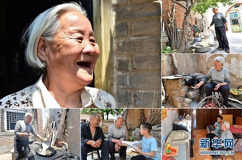 田何英,女,1949年出生,山西省長治市潞城區(qū)上黃村人,全家人靠種植5畝糧食地過日子,家人的重病使其陷入貧困。2015年開始,田何英和家人享受種植產(chǎn)業(yè)補貼和金融扶貧補貼,孫子上學享受“雨露計劃”補貼。2017年,田何英家脫了貧。 左上:田何英肖像;右上:田何英在院子里;右中:田何英在生火做飯;右下:田何英和孫子一起看電視;下中:田何英(中)和家人在院子里;下左:田何英在做飯(拼版照片,6月11日攝)。 地處晉東南的山西省長治市,位于由太行山、太岳山環(huán)繞而成的上黨盆地中。在群山中、崖壁上,許多村莊自然條件惡劣,基礎設施落后,脫貧致富是大山深處人們的迫切心愿。 近年來,一場場脫貧攻堅戰(zhàn),在一個個深山村打響。政府全力探索脫貧路徑的同時,山區(qū)百姓因地制宜,靠自己的雙手和智慧走上致富路,交出了一份扎實的脫貧答卷。 記者在太行山、太岳山一路尋訪,記錄下多位70歲老人的生活。這些共和國的同齡人,親歷了山鄉(xiāng)的巨變,見證著長治山區(qū)脫貧攻堅偉大工程的一步步推進。 新華社記者 曹陽 攝