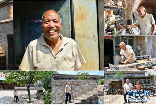 韓忠岐,男,1949年出生,山西省長治市潞城區(qū)垂陽村人,1976年起擔(dān)任村干部。從小熱愛學(xué)習(xí)的韓忠岐對鄉(xiāng)村發(fā)展有自己獨(dú)特的想法,他鼓勵村民們學(xué)習(xí)技能,在農(nóng)閑時(shí)“組團(tuán)”外出打工,農(nóng)忙時(shí)鄰里互幫互助,曾經(jīng)貧窮的垂陽村在他的帶領(lǐng)下慢慢富裕起來。退休后,閑不下來的韓忠岐自學(xué)打鐵、電焊技能,現(xiàn)在成了鄉(xiāng)里小有名氣的鐵匠,經(jīng)常為貧困戶開展技術(shù)培訓(xùn)。 左上:韓忠岐肖像;右上:韓忠岐在挑選工具;右中:韓忠岐在制作一個(gè)鐵皮抽屜;右下:韓忠岐和老伴坐在院子里;下中:韓忠岐去鄰居家串門;下左:韓忠岐在院子里乘涼(拼版照片,6月18日攝)。 地處晉東南的山西省長治市,位于由太行山、太岳山環(huán)繞而成的上黨盆地中。在群山中、崖壁上,許多村莊自然條件惡劣,基礎(chǔ)設(shè)施落后,脫貧致富是大山深處人們的迫切心愿。 近年來,一場場脫貧攻堅(jiān)戰(zhàn),在一個(gè)個(gè)深山村打響。政府全力探索脫貧路徑的同時(shí),山區(qū)百姓因地制宜,靠自己的雙手和智慧走上致富路,交出了一份扎實(shí)的脫貧答卷。 記者在太行山、太岳山一路尋訪,記錄下多位70歲老人的生活。這些共和國的同齡人,親歷了山鄉(xiāng)的巨變,見證著長治山區(qū)脫貧攻堅(jiān)偉大工程的一步步推進(jìn)。 新華社記者 曹陽 攝
