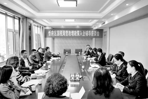 本報訊 4月19日下午,忻府區(qū)國稅局營改增政策入企輔導(dǎo)座談會在忻州國力房地產(chǎn)開發(fā)有限公司會議室召開。區(qū)局黨組書記、局長郭靜出席,政策法規(guī)科科長王繼紅主持會議,稅源管理科負(fù)責(zé)人和房地產(chǎn)企業(yè)代表一同參加。