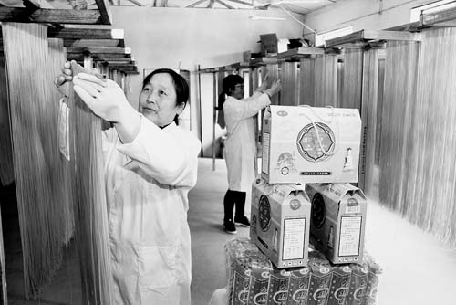 7月20日,工人正在晾曬生產(chǎn)出的“河撈面”。始制于北宋年間的五臺縣民間美食“河撈面”,如今又被該縣豆村鎮(zhèn)列為產(chǎn)業(yè)扶貧項目。在當?shù)兀粋€由興坪村“霞輝”玉米加工專業(yè)合作社生產(chǎn)出的玉米、高粱、蕎麥、大豆等12類盒裝與袋裝產(chǎn)品,已俏銷太原、忻州等食品市場,年產(chǎn)值達56萬元。(金俊賢 攝)