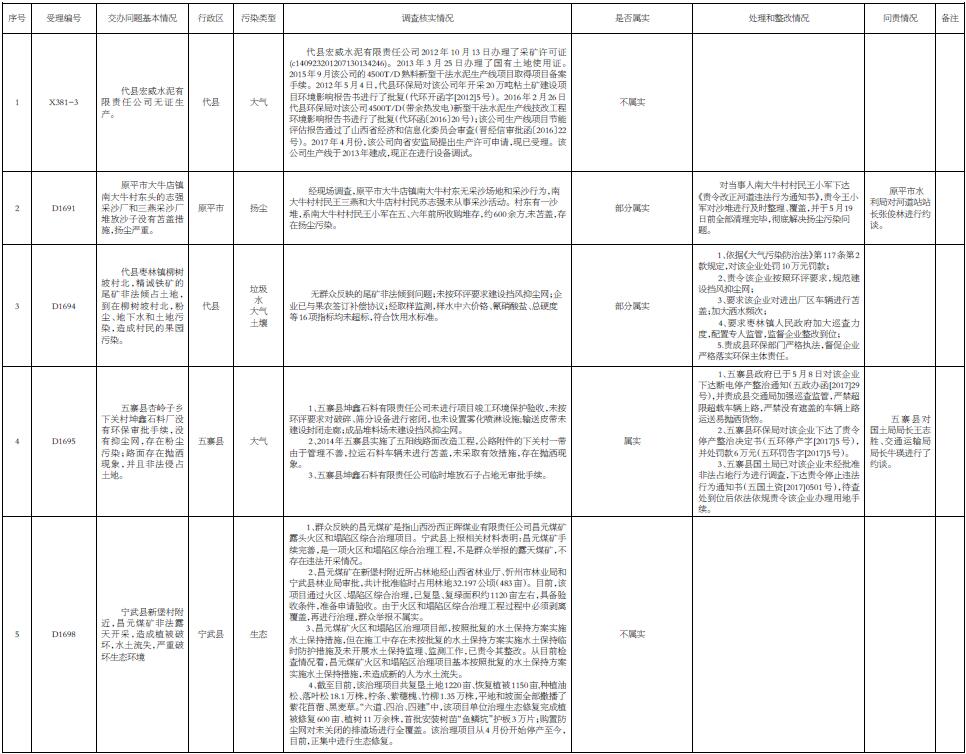 我市高度重視,立即組織查處,截至5月18日,督辦的5件群眾反映問題已辦結(jié)。其中,確認屬實1件;確認部分屬實2件;確認不屬實2件。對于屬實和部分屬實已辦結(jié)的環(huán)保問題,分別采取了相應處理措施,其中停產(chǎn)整治1件,罰款6萬元,對3名相關(guān)責任人進行約談。對5件群眾反映問題調(diào)查處理情況進行了信息公開。