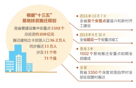 “十三五”易地扶貧搬遷啟動以來,我省有36.2萬貧困人口告別山莊窩鋪,搬進(jìn)了公共設(shè)施配套齊全、產(chǎn)業(yè)就業(yè)措施完善的1502個(gè)易地扶貧搬遷集中安置點(diǎn),這些安置點(diǎn)已成為貧困群眾穩(wěn)定脫貧的新起點(diǎn)、走向全面小康的新支點(diǎn)、實(shí)現(xiàn)鄉(xiāng)村振興的新亮點(diǎn)。