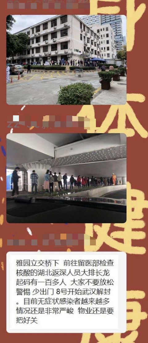 “雅園立交橋下,前往留醫(yī)部檢查核酸的湖北返深人員大排長龍,起碼有一百人,大家不要放松警惕,少出門?!?日,這段文字和兩張大排長龍的圖片在網(wǎng)上流傳。記者9日從深圳市人民醫(yī)院獲悉,該情況并不屬實(shí)。一份核酸取樣平均時間為數(shù)秒鐘,醫(yī)院核酸檢測排隊(duì)患者一般在10~50人之間,因?yàn)樾枰3?米隔離,隊(duì)伍會比較長,但也未超過百米,更不存在排出醫(yī)院大門外或雅園立交橋下,市民無需緊張。