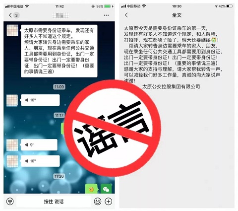 近日,微信朋友圈、釘釘、微博等社交平臺(tái)均在傳播“乘坐公交車(chē)需要出示身份證”的傳言。您收到了嗎?