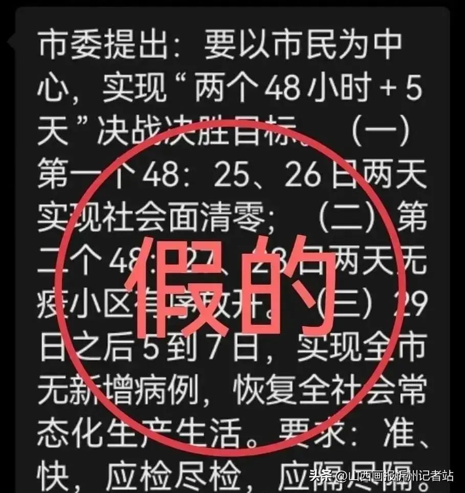近日,多個(gè)微信群都在熱傳這樣一條消息。內(nèi)容為:市委提出:要以市民為中心,實(shí)現(xiàn)“兩個(gè)48小時(shí)+5天”決戰(zhàn)決勝目標(biāo)。(一)第一個(gè)48:25、26日兩天實(shí)現(xiàn)社會面清零;(二)第二個(gè)48:27、28日兩天無疫小區(qū)有序放開。(三)29日之后5到7日,實(shí)現(xiàn)全市無新增病例,恢復(fù)全社會常態(tài)化生產(chǎn)生活。要求:準(zhǔn)、快,應(yīng)檢盡檢,應(yīng)隔盡隔。