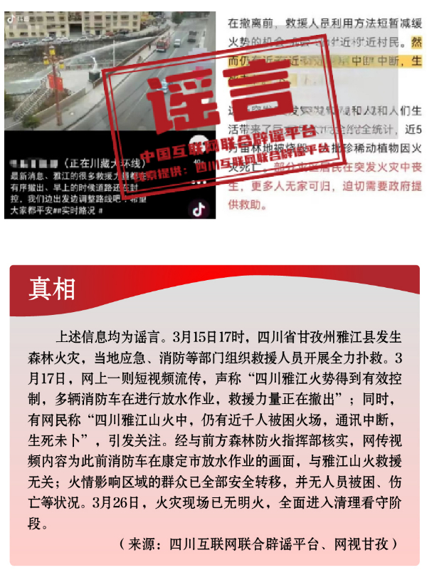 為博流量炮制安全類謠言,引發(fā)恐慌。春季歷來是森林火災(zāi)高發(fā)時(shí)段。加之開春后,工廠企業(yè)復(fù)產(chǎn)復(fù)工,致災(zāi)因素明顯增多。3月,全國多地發(fā)生火災(zāi)事故,一些網(wǎng)民為蹭熱點(diǎn)、博流量,趁機(jī)編織謠言,引發(fā)公眾恐慌。3月中旬,四川省甘孜州雅江縣發(fā)生森林火災(zāi),在當(dāng)?shù)貞?yīng)急、消防等部門組織救援人員全力撲救之際,卻有人編造“四川雅江山火救援力量正在撤出”“雅江仍有近千人被困火場(chǎng)”“雅江山火有三名撲火人員犧牲”等失實(shí)信息,嚴(yán)重干擾災(zāi)害應(yīng)急響應(yīng)和救援工作?!爸貞c南坪商業(yè)大樓火災(zāi)傷亡慘重”“湖南省長(zhǎng)沙市天心區(qū)發(fā)生重大刑案,警方發(fā)布懸賞通告”“天津一銀行發(fā)生搶劫”等嚴(yán)重失實(shí)的涉公共安全類視頻流傳網(wǎng)絡(luò),或是造謠者自編自導(dǎo),或是利用AI技術(shù)偽造,卻引發(fā)群眾恐慌、造成惡劣影響。此外,“綠得發(fā)黑的菠菜不能吃”“清明蔗、毒過蛇”等食品安全類謠言,則是利用了時(shí)令和人們對(duì)食物中毒的擔(dān)憂情緒,夸大其詞、危言聳聽,目的都是販賣焦慮、制造恐慌,進(jìn)而吸引眼球、騙取流量。