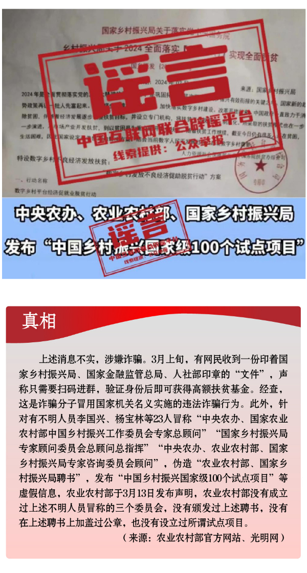 假冒權(quán)威杜撰政策類謠言,誤導(dǎo)公眾。3月以來,一些不法分子或機(jī)構(gòu)打著權(quán)威旗號(hào),假冒國家機(jī)關(guān)、偽造政府公文、歪曲解讀政策,企圖行騙牟利。如,詐騙分子冒用國家機(jī)關(guān)名義,假稱“國家發(fā)放2024年鄉(xiāng)村振興扶貧補(bǔ)貼”“鄉(xiāng)村振興項(xiàng)目有國家級(jí)試點(diǎn)100個(gè)”“‘退稅綠色通道’加快退稅到賬速度”等,實(shí)施違法詐騙行為,給社會(huì)公眾造成極大信息和資金安全風(fēng)險(xiǎn)。還有人制造、傳播“我國城鄉(xiāng)居民醫(yī)保參保人數(shù)近年來持續(xù)下降,部分地區(qū)農(nóng)村出現(xiàn)醫(yī)保退保潮”“失業(yè)保險(xiǎn)金只能領(lǐng)一次,最多領(lǐng)24個(gè)月”“我國社?;鹑冀唤o外資機(jī)構(gòu)管理”等一系列與事實(shí)嚴(yán)重不符的涉公共謠言,迷惑性大、蠱惑性強(qiáng),極易誤導(dǎo)公眾,對(duì)我國現(xiàn)有社保政策和相關(guān)工作造成負(fù)面影響。