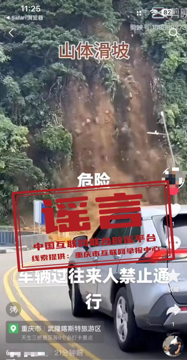 真相:近日,有網(wǎng)民發(fā)布了一則“山體滑坡危險(xiǎn),過往車輛行人禁止通行”的視頻,視頻定位標(biāo)注為“重慶市武隆喀斯特旅游區(qū)”。經(jīng)重慶市武隆區(qū)多部門核實(shí),該區(qū)近期未發(fā)生大面積山體滑坡事件。網(wǎng)傳視頻實(shí)為2024年6月3日臺(tái)灣省基隆市中正區(qū)潮境公園入口發(fā)生的大規(guī)模山體滑坡事件,而視頻中所標(biāo)注的定位信息系網(wǎng)民發(fā)布視頻的地點(diǎn),而非事件發(fā)生的地點(diǎn)。(來源:“重慶辟謠”微信公眾號(hào)、網(wǎng)信武隆