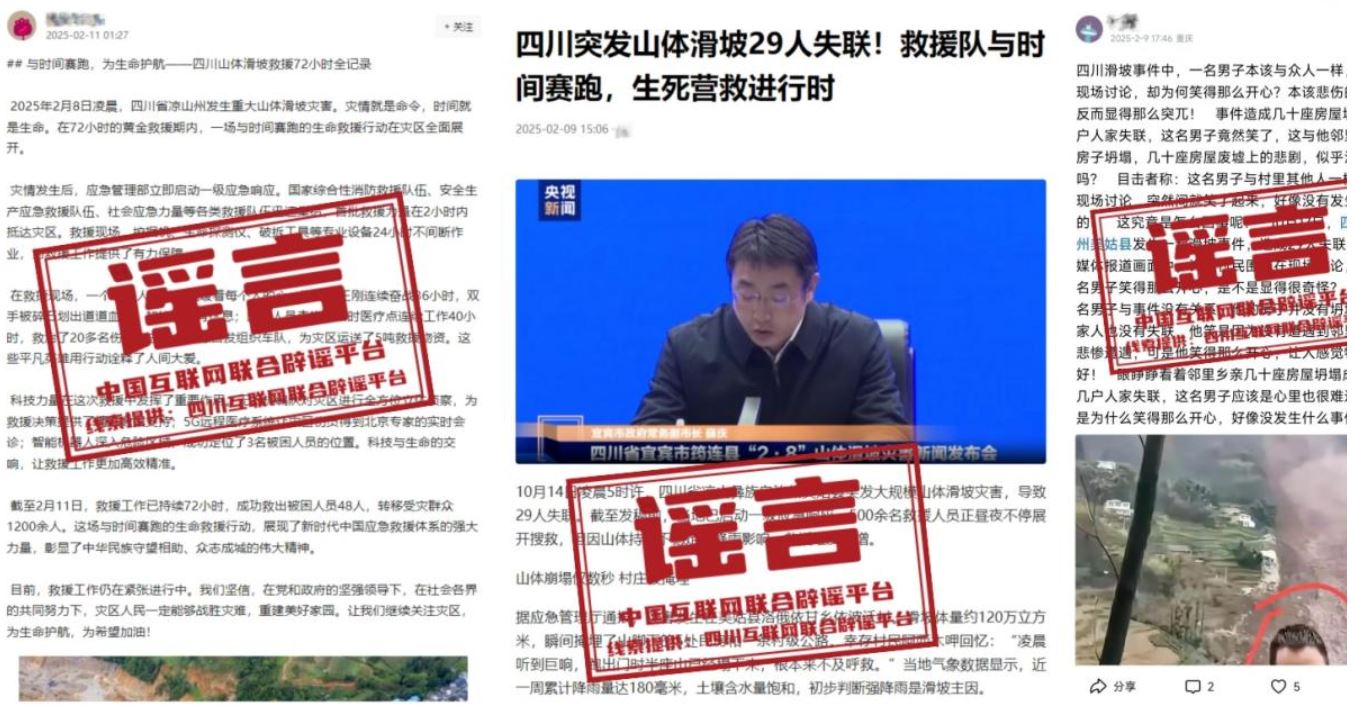 2月9日,有網(wǎng)民在某網(wǎng)絡(luò)平臺發(fā)布題為《30人被埋!四川山體崩塌瞬間曝光,行車記錄儀拍下死神奪命10秒》的帖文。經(jīng)核實,帖文配圖均為嫁接舊聞、圖文翻炒,網(wǎng)民將2024年8月茂縣山體滑坡救援現(xiàn)場、2016年12月宜賓市長寧縣下長鎮(zhèn)永利村一村民被推土機(jī)掩埋致死事件的舊聞重新拼接合成,編造為宜賓筠連山體滑坡最新動態(tài)后發(fā)布。(來源:四川互聯(lián)網(wǎng)舉報辟謠平臺、宜賓網(wǎng)警)