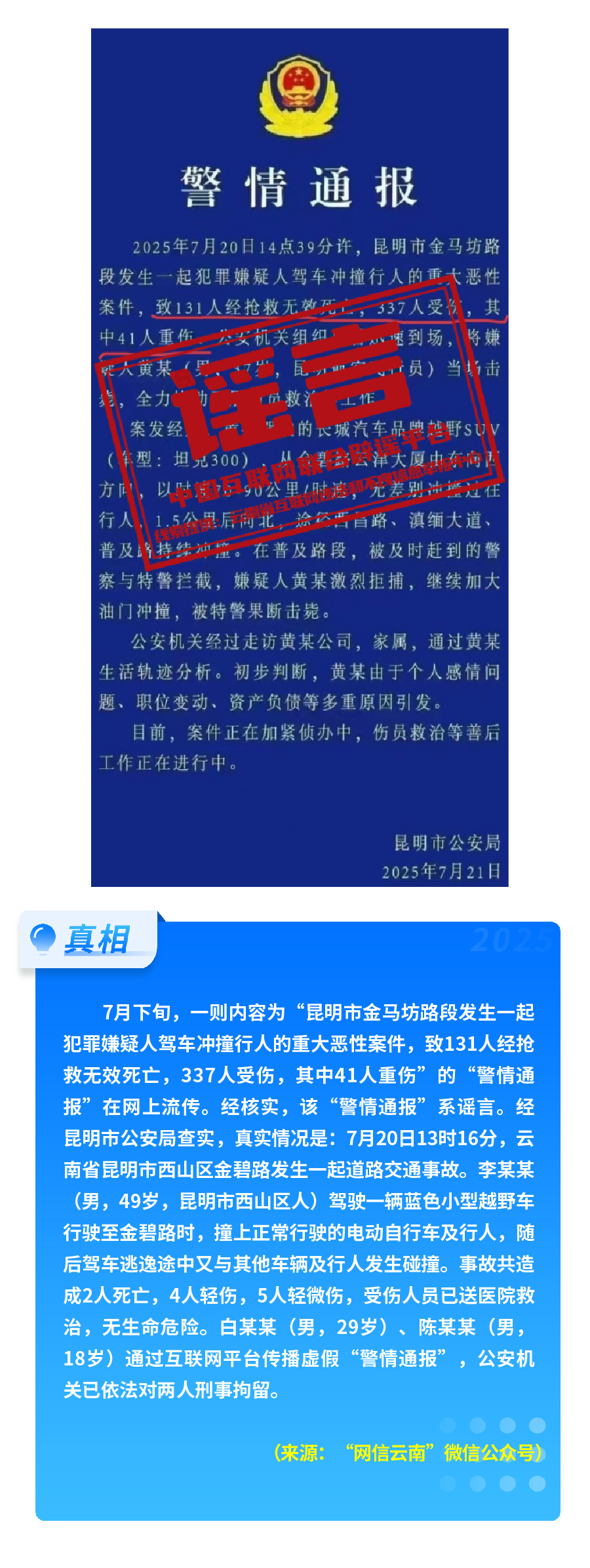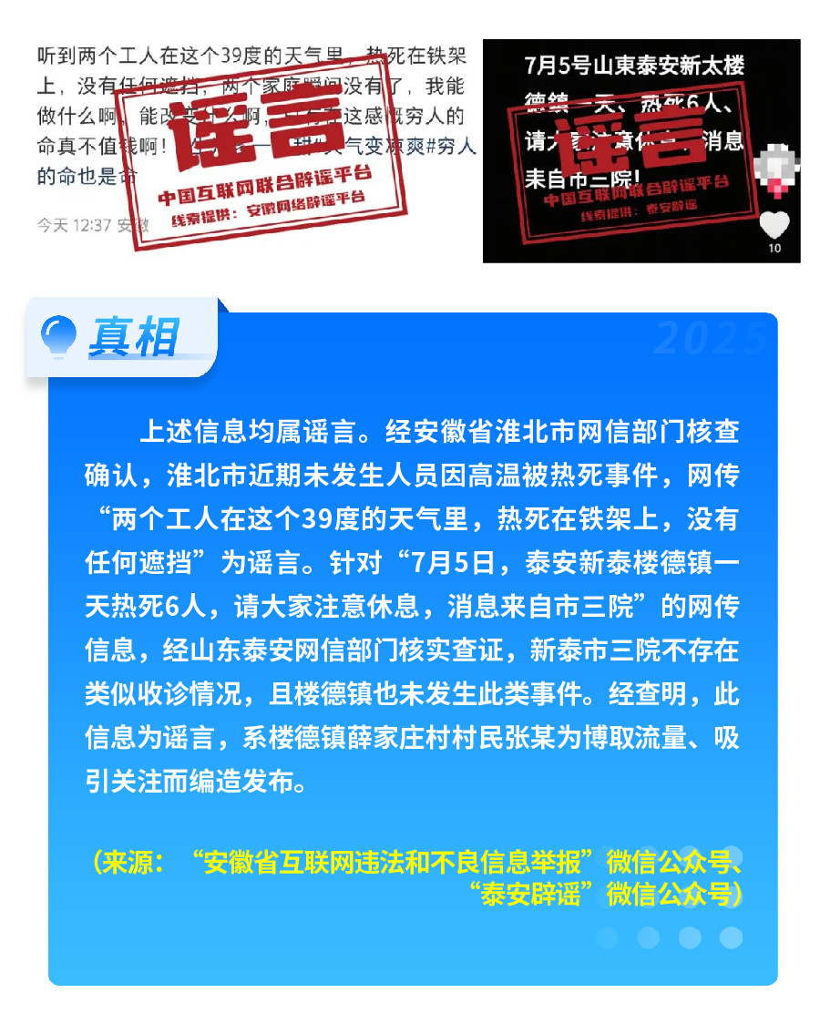 近期,網(wǎng)上接連出現(xiàn)發(fā)布虛假“警情通報”的惡性造謠傳謠案件,炮制傳播“昆明駕車撞人案131人死亡”“杭州自來水接入糞水”及涉釋永信虛假“警情通報”,模仿“藍底白字”格式,杜撰聳人聽聞細節(jié),損害政府公信力,嚴重擾亂社會秩序。“院士預(yù)測廣東將發(fā)生8級以上大地震”公然偽造專家聊天截圖,謊報地震預(yù)警。還有造謠者借盛夏高溫酷暑與洪澇災(zāi)害,編造“安徽淮北、山東泰安等地多人因高溫死亡” “重慶大暴雨導(dǎo)致15人死亡、4人失蹤”等謠言,蹭炒熱點、煽動情緒。