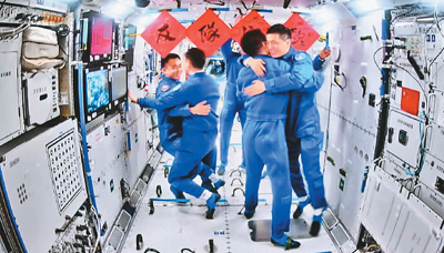 4月26日在軌執(zhí)行任務(wù)的神舟十七號航天員乘組順利打開“家門”,歡迎遠(yuǎn)道而來的神舟十八號航天員乘組入駐“天宮”。新華社記者 金良快攝