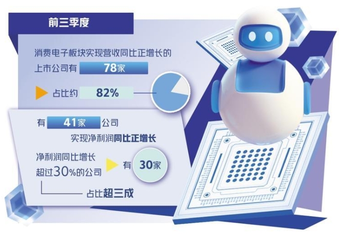今年以來(lái),消費(fèi)電子板塊復(fù)蘇明顯。數(shù)據(jù)顯示,前三季度,消費(fèi)電子板塊實(shí)現(xiàn)營(yíng)收同比正增長(zhǎng)的上市公司有78家,占比約82%;有41家公司實(shí)現(xiàn)凈利潤(rùn)同比正增長(zhǎng),凈利潤(rùn)同比增長(zhǎng)超過(guò)30%的公司有30家,占比超三成。尤其是第三季度,行業(yè)延續(xù)復(fù)蘇趨勢(shì),一批公司實(shí)現(xiàn)營(yíng)收、凈利潤(rùn)的雙增長(zhǎng)。