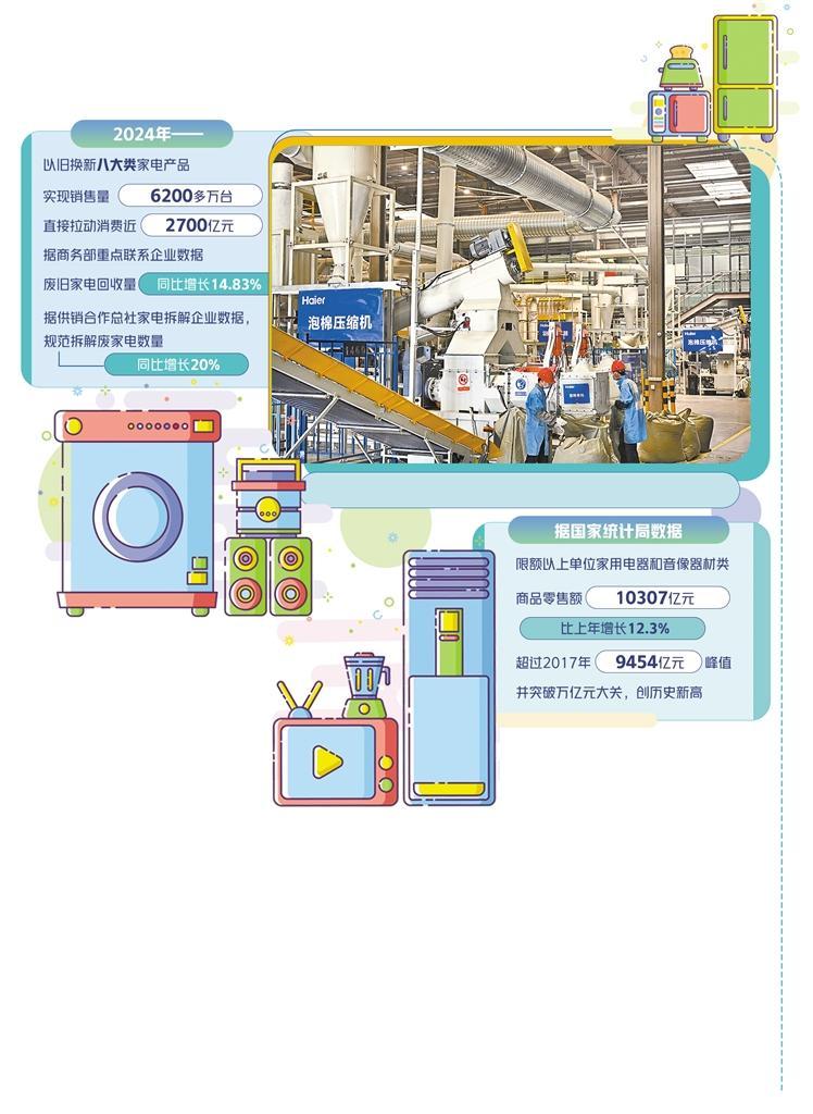 自《推動大規(guī)模設備更新和消費品以舊換新行動方案》(以下簡稱《行動方案》)實施以來,家電市場消費潛力得到顯著釋放。數(shù)據(jù)顯示,2024年,中央加力支持以舊換新八大類家電產品實現(xiàn)銷售量6200多萬臺,直接拉動消費近2700億元。日前,國家發(fā)展改革委副主任趙辰昕在國務院政策例行吹風會上介紹,2025年將延續(xù)并加力擴圍實施“兩新”政策,享受以舊換新補貼的家電產品種類由2024年的8類增至12類,單件最高補貼可達銷售價格的20%。