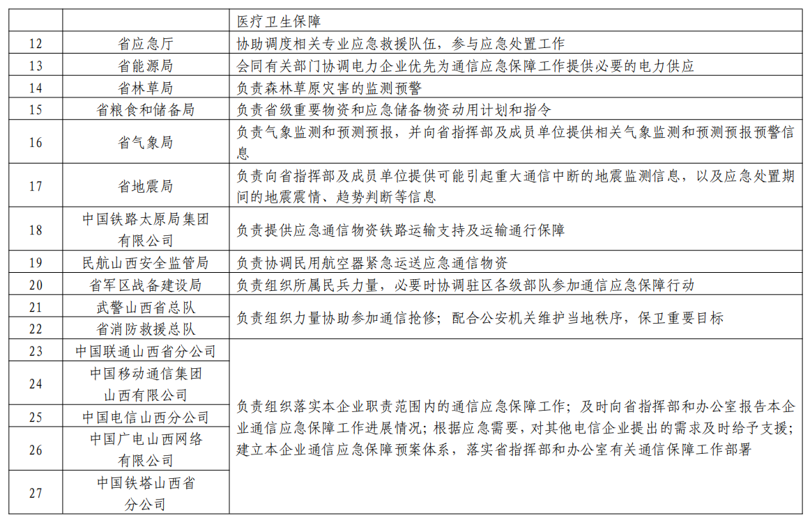 成員:省通信管理局、省委宣傳部、省委網(wǎng)信辦、省發(fā)展改革委、省公安廳、省財政廳、省自然資源廳、省交通廳、省水利廳、省衛(wèi)健委、省應急廳、省能源局、省林草局、省糧食和儲備局、省氣象局、省地震局、中國鐵路太原局集團有限公司、民航山西安全監(jiān)管局、省軍區(qū)戰(zhàn)備建設局、武警山西省總隊、省消防救援總隊以及省基礎電信企業(yè)等部門單位相關(guān)負責人。