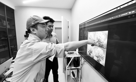 當(dāng)下,“犀牛創(chuàng)意”傳媒工作室承接了一家老廠區(qū)的老物件展覽業(yè)務(wù),田帥和韓宇帶著自己的創(chuàng)意向AI“提問(wèn)”,AI生成了文案及一系列設(shè)計(jì)圖稿,由甲方選擇后他們?cè)倬?xì)加工,工作高質(zhì)高效的同時(shí)節(jié)省了大量的人力物力,降低了時(shí)間和經(jīng)濟(jì)成本。