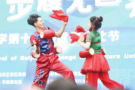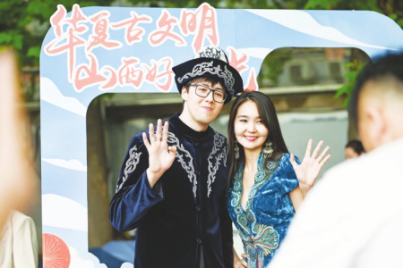 當(dāng)日活動吸引了來自世界各地的3萬余名師生及社會各界人士。獨唱《人說山西好風(fēng)光》《千年一塔》,舞蹈《醋之韻》《翼城花鼓》等贏得師生們熱烈掌聲。在五大洲文化展區(qū),絳州木版年畫傳承人吳百鎖現(xiàn)場印制木版年畫贈送師生,成為一道亮麗風(fēng)景。廣靈剪紙、應(yīng)縣木塔模型、黎侯虎、寧武毛健茶等吸引各國留學(xué)生駐足欣賞?!叭A夏古文明山西好風(fēng)光”主題相框前,無數(shù)外國友人饒有興趣交流互動,拍照留念?!吧轿髟亍被鸨本┱Z言大學(xué)世界文化節(jié)。