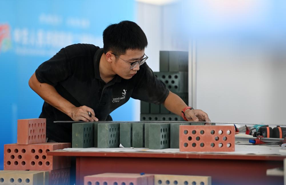 2023年9月17日,在國(guó)家會(huì)展中心(天津)舉辦的中華人民共和國(guó)第二屆職業(yè)技能大賽進(jìn)入第二天,參賽選手在參加砌筑項(xiàng)目比賽。新華社記者 趙子碩 攝