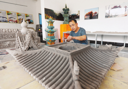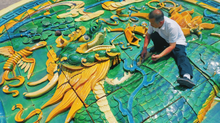 4月22日,國(guó)家級(jí)非遺項(xiàng)目琉璃燒制技藝傳承人劉開寶將制作的琉璃制品“麒麟獻(xiàn)端”交付客戶。