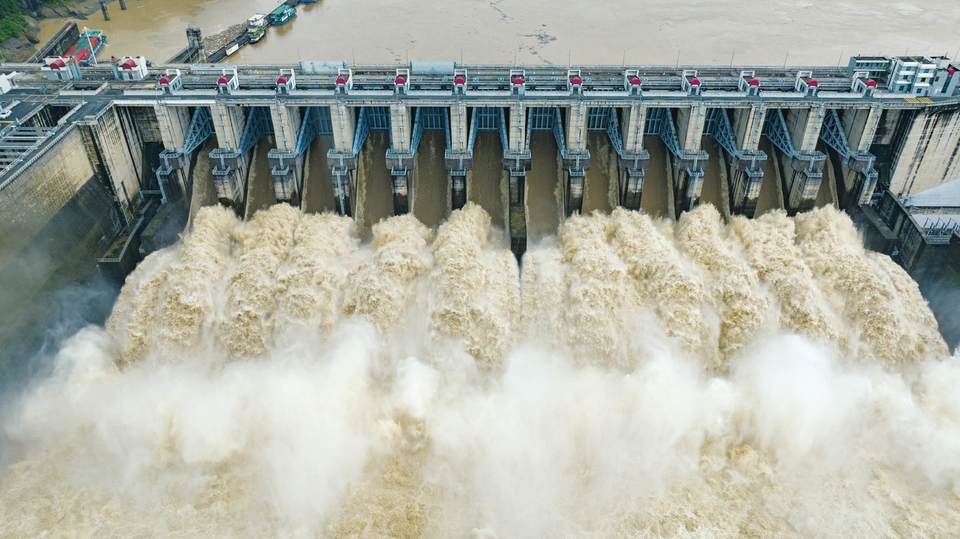 圖為6月16日,福建省閩江水口水電站12扇閘門全部開(kāi)啟泄洪。