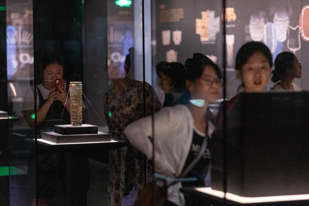 在四川廣漢三星堆博物館文物保護(hù)與修復(fù)館,游客在“匠心妙手——三星堆遺址新出土文物保護(hù)修復(fù)成果展示”試開放期參觀(7月22日攝)。新華社記者 唐文豪 攝
