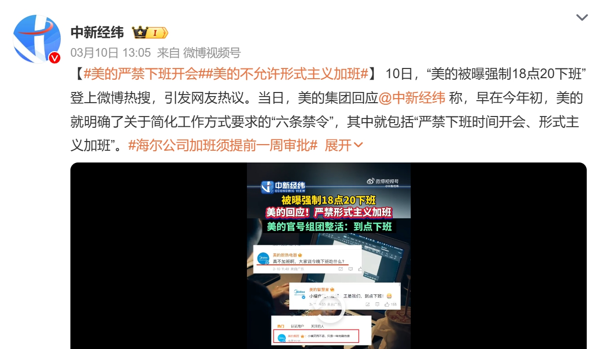 美的回應(yīng)媒體時表示,今年以來,美的明確了關(guān)于簡化工作方式要求的“六條禁令”,其中就包括“嚴(yán)禁下班時間開會、形式主義加班”。