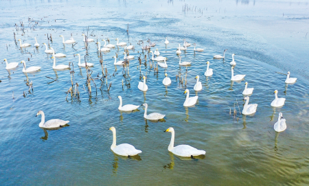 白天鵝來平陸黃河濕地過冬,從一 開始的幾百只到去年近1.6萬只,背后是平陸縣的不斷努力。何建喜介紹,為讓天鵝愜意棲息,平陸縣在濕地周圍搭建隔離網(wǎng)、懸掛警示牌,并種上了小麥、大豆等農作物,確保天鵝有充足的越冬食物。同時,還設立了兩個白天鵝巡護站,安裝了遠程監(jiān)控系統(tǒng),平陸縣林業(yè)局等部門聘用20余名專職人員全天候巡護,定點、定量投食。