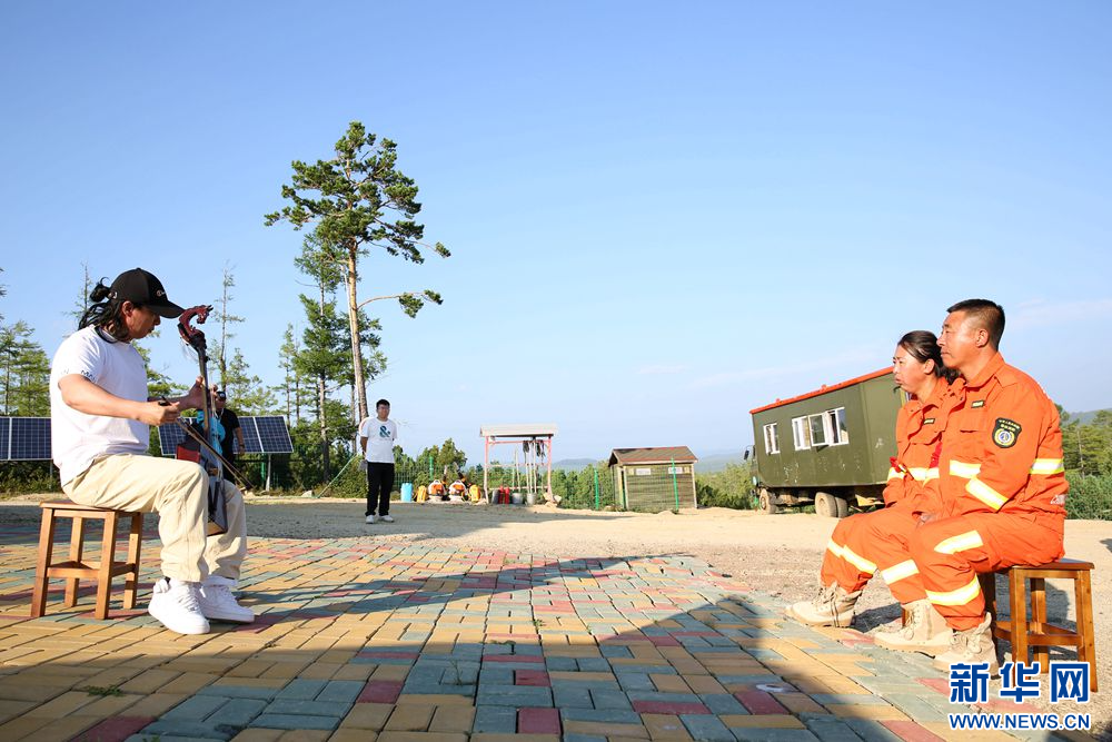 內(nèi)蒙古大興安嶺烏蘭牧騎隊員走上爬松嶺管護(hù)瞭望站,為孫華李穎夫婦獻(xiàn)上精彩演出(拍攝于8月12日)。新華網(wǎng)石毅 攝