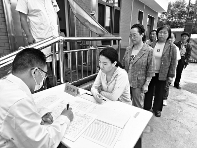 “有沒有基礎(chǔ)疾?。俊薄坝袥]有過敏史?”“早上吃飯了沒?”……8月20日10時(shí),在靜樂縣杜家村鎮(zhèn)中心衛(wèi)生院的門口,等著要體檢的村民們已經(jīng)排起了長(zhǎng)隊(duì)。