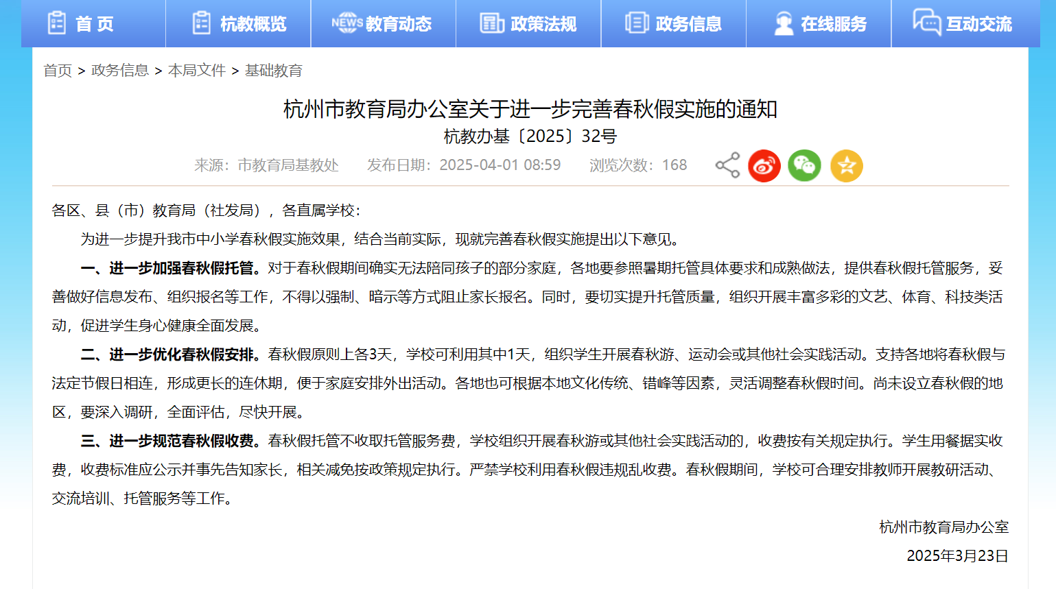 ▲杭州市教育局明確要求春秋假托管不收取托管服務(wù)費