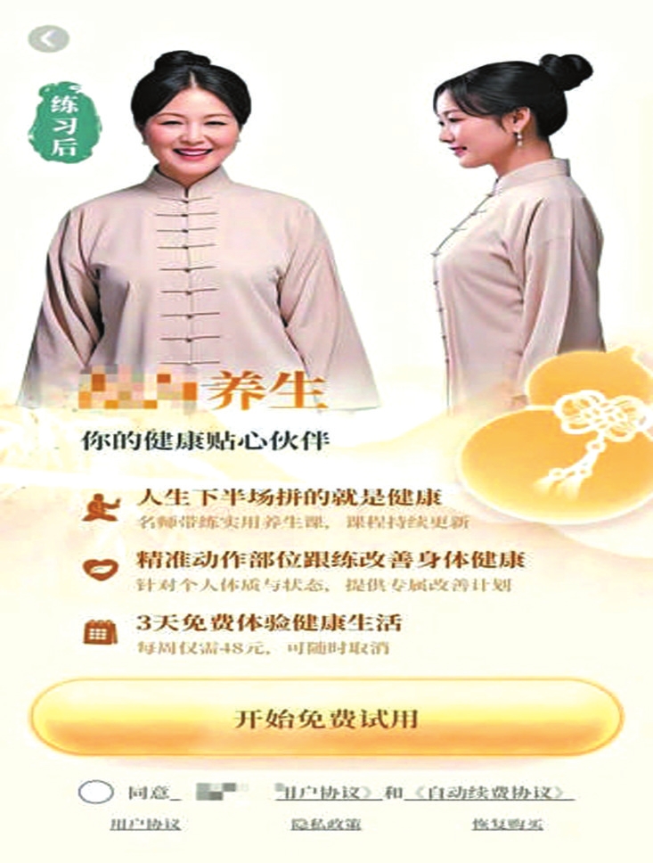 還有些App則更加離譜,下載完成后,點進去的第一步就是要購買會員,之后才能正常使用。但在購買流程上,平臺卻耍起了花招。比如一款提供“養(yǎng)生指導服務”的App,頁面上會有一個大大的按鈕,寫著“開始免費試用”。但在按鈕的旁邊,卻有一行非常不起眼的小字:“每周僅需48元,可隨時取消。”而一旦用戶點擊開始試用,系統(tǒng)就會跳轉到自動續(xù)費的開通界面。如果是辨別能力差的老人,可能還以為是在填寫什么注冊信息。