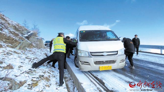 10月16日,五臺(tái)山景區(qū)境內(nèi)出現(xiàn)雨夾雪天氣,伴隨著氣溫下降,部分路段出現(xiàn)積雪。當(dāng)日7時(shí)許,五臺(tái)山公安分局接到游客報(bào)警稱,在景區(qū)北線鴻門巖路段,由于下雪后道路有大量積雪成冰,導(dǎo)致多輛大巴車和轎車受阻無法通行,請(qǐng)求援助。