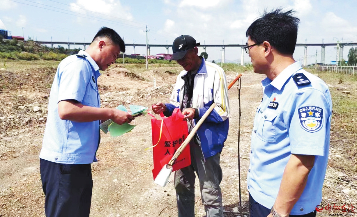連日來,五寨火車站派出所精心組織、全力投入,防范和嚴(yán)厲打擊各類違法犯罪活動,深入開展線路隱患排查整治活動,確保線路安全暢通。圖為民警在李家坪村對放牧戶進(jìn)行法治宣傳教育。(索效光 攝)