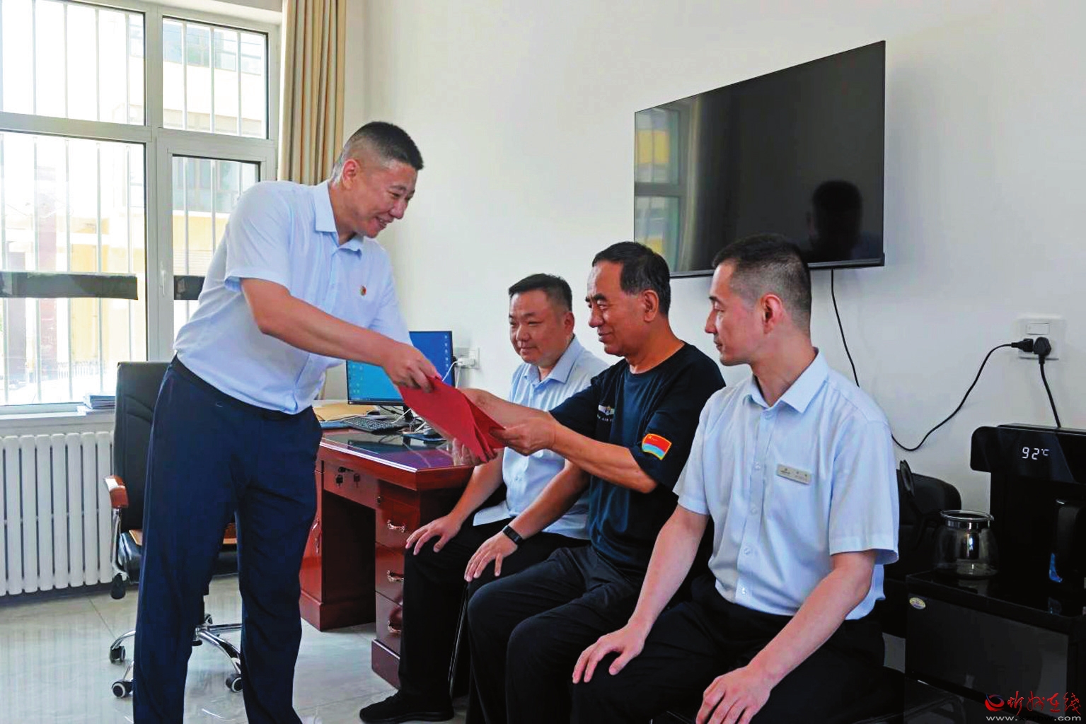 “八一”節(jié)前夕,河曲農(nóng)商銀行負(fù)責(zé)人走進唐家會支行走訪慰問在一線工作的退役軍人員工郭文毅、劉躍、左貴才,向他們送去慰問金,并致以節(jié)日的美好祝福和誠摯問候。希望他們永葆退伍不退志、退役不褪色的政治本色。(左航愷 攝)
