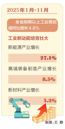 數(shù)據(jù)顯示,2025年1月—11月,全省規(guī)模以上工業(yè)增加值同比增長4.6%,工業(yè)新動能培育壯大,新能源產(chǎn)業(yè)增長27.1%,高端裝備制造產(chǎn)業(yè)增長8.5%,新材料產(chǎn)業(yè)增長5.3%,為全省經(jīng)濟(jì)發(fā)展提供了堅(jiān)實(shí)支撐。